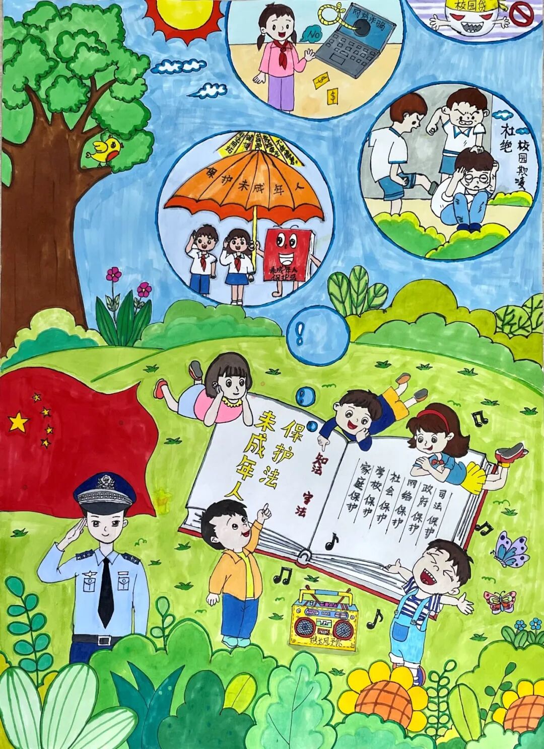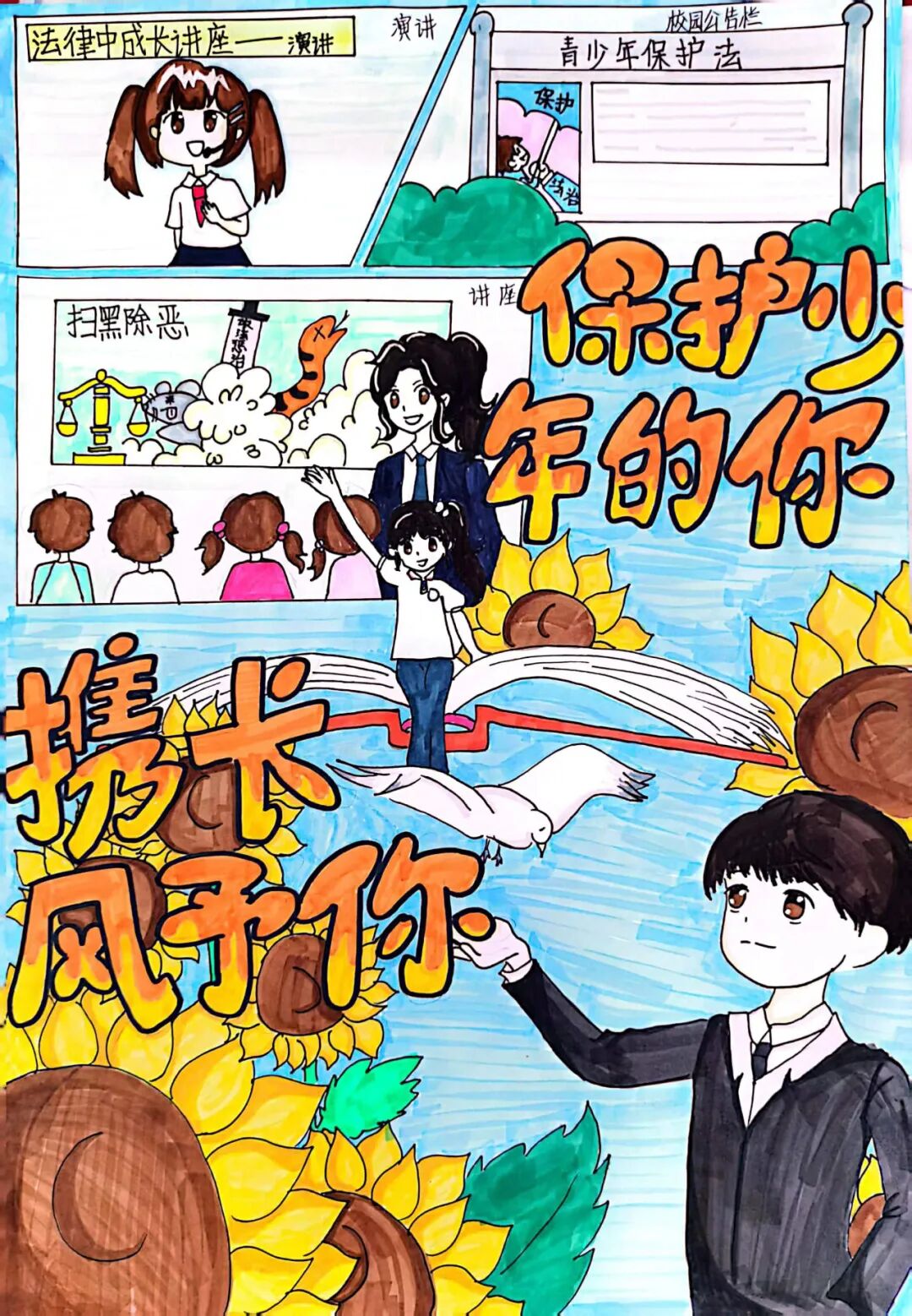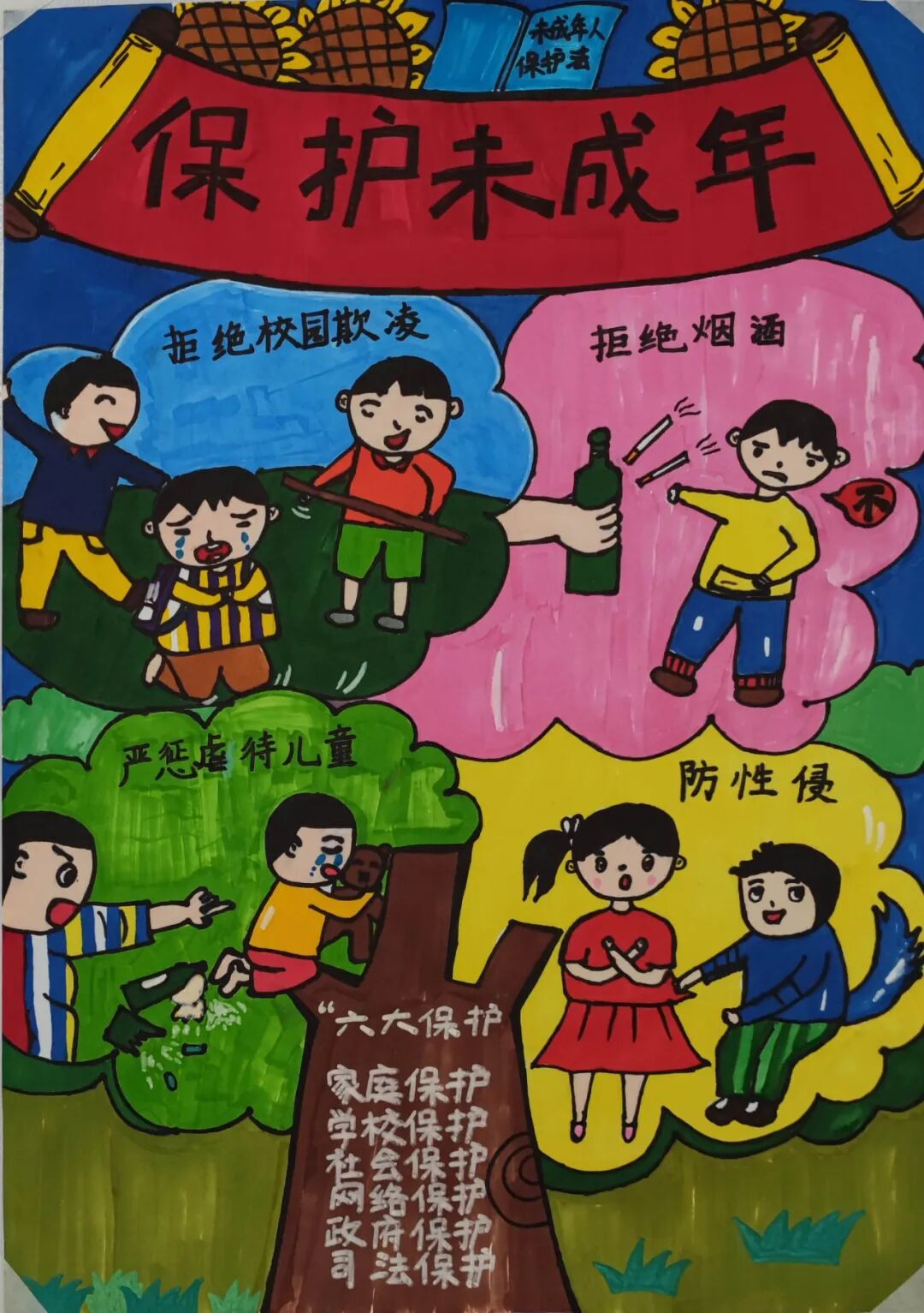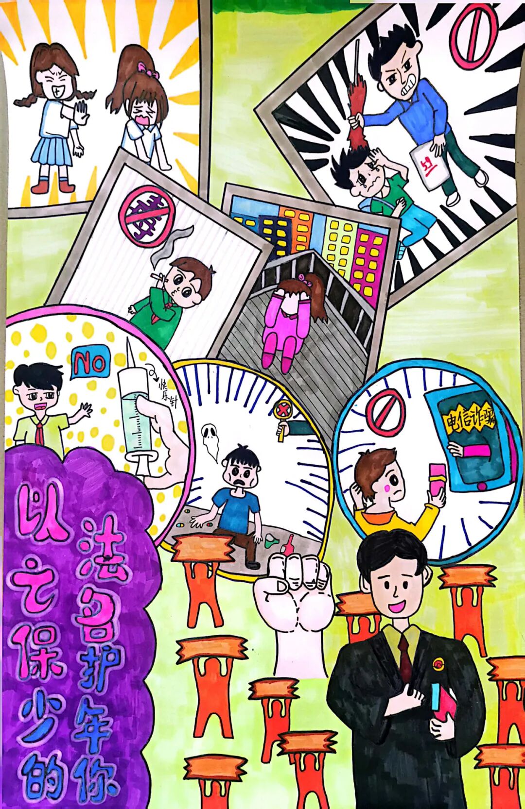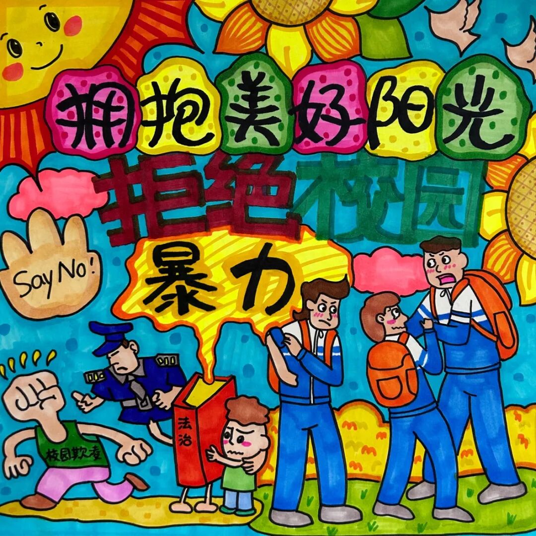 我想通过这幅作品来表达保护青少年,拒绝校园暴力的主题。首先我通过一副插画来表现青少年学习法律知识的重要性,拿起法律武器来有效抵抗校园暴力,然后我绘画了一组校园欺凌的场景,配以醒目的标语——拥抱美好阳光 拒绝校园暴力,来突出主题,呼吁大家学法懂法拒绝校园暴力。