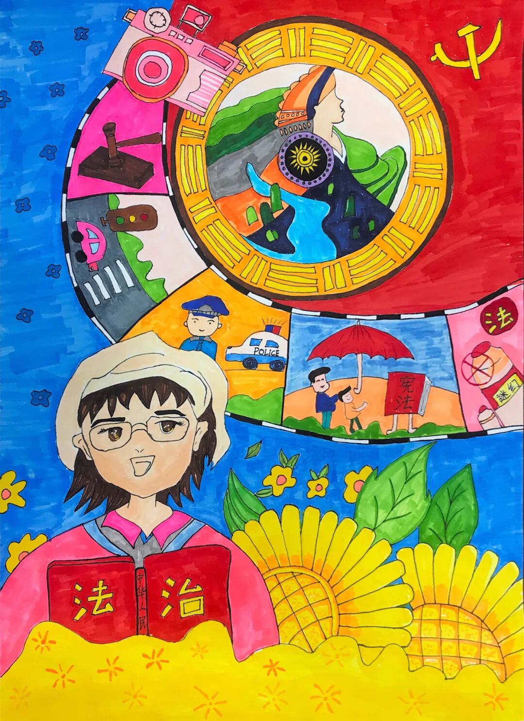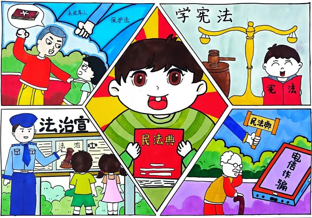 这幅画围绕着“法”展开,一共分为五个画面,中心位置由一个男孩手捧民法典,中心主色调为红黄,加上绿色做对比,使画面中心更加突出,着重突出宣传宪法,让人们心中有法,学好宪法,宣传、普及法律知识。