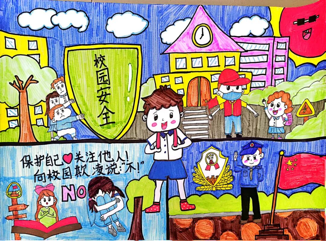 画面中的小男孩勇敢、正义、善良、有责任感,我希望每位同学都向他学习。同时,图画也表达了老师和家长们以及检察官对小朋友们学习生活上的关心。图画还以象征和平、安全的蓝色为背景,展现出和谐美好的校园环境。