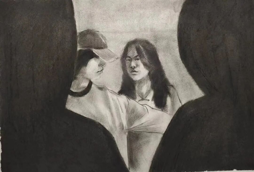 画面中的黑影代表霸凌者,女同学被逼到墙角气氛压抑、眼神无助,戴帽子的同学挺身而出用身体护住被欺凌的女同学,传递出反对校园霸凌的主题,旨在告诉同学们应该勇敢站出来说“不”,保护弱小的同学,合理合法地对抗黑恶势力。