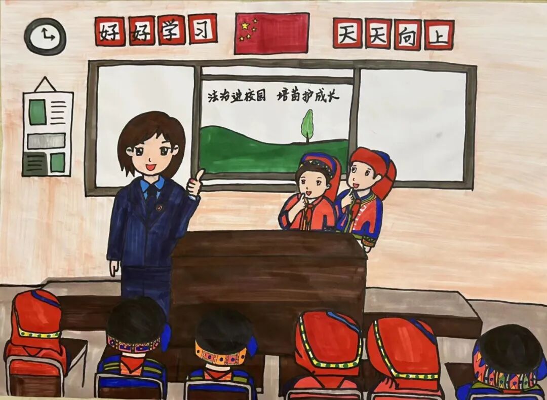 作品中小朋友在认真听检察官叔叔讲《未成年人保护法》,小朋友们在法治小课堂中懂得了通过法律来保护自我,并帮助他人。作品旨在传递青少年学习法律知识极为重要,让我们在健康安全的环境下成长。